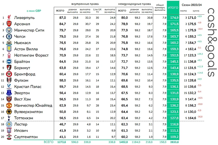 Английская Премьер-лига недавно опубликовала суммы призовых выплат по итогам прошедшего сезона. Всего 20 клубов получили от лиги 2,838 млрд фунтов стерлингов. Распределение представлено в таблице ниже.