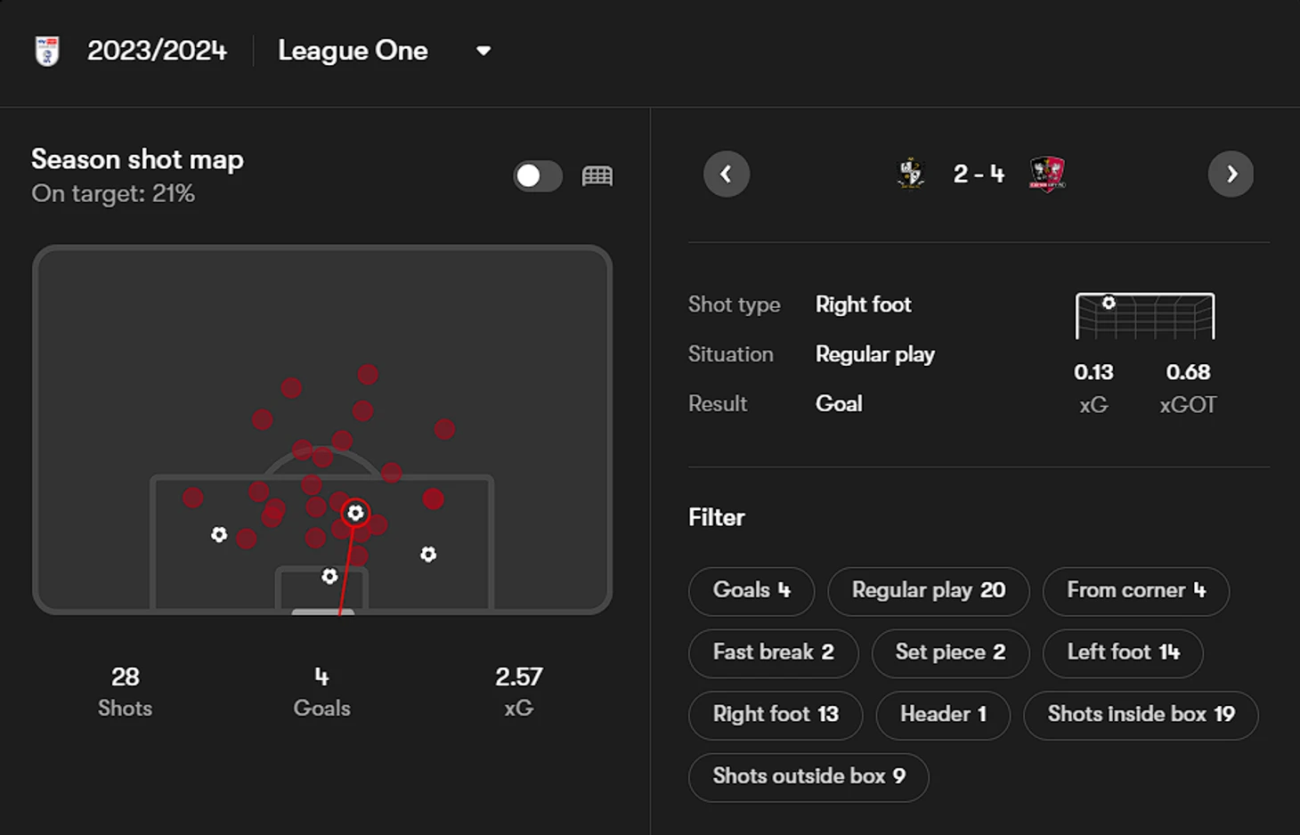 Но главное его умение это конечно идеальные по времени входы в штрафную. Ему хватает быстроты ног, чтобы оторваться почти от любого прикрытия. Он здорово предугадывает откаты мяча назад и располагается так, чтобы партнеру было удобнее отдать пас. При этом, Харрис сам классно умеет подстроиться почти под любую передачу, потому что обладает ударом с обеих ног. Причем бить он может под углом к воротам, ногой, оттянутой назад, без спуска мяча на землю. Реализует свои моменты он прям на уровне нападающего, и что важно, после удара продолжает движение на случай необходимости добивания. Есть опасения, что в Чемпионшипе его не будут пускать в штрафную, тем более «Оксфорд» традиционно собирает минимум касаний в ней. Но один гол с дальнего расстояния я у него тоже нашел, пусть и в мусорное время. Кроме того, получая мяч в штрафной, Люк вовремя понимает, когда защитники накрывают его, и способен придумать эффективное продолжение атаки, а не просто пинает мяч в очевидный блок.