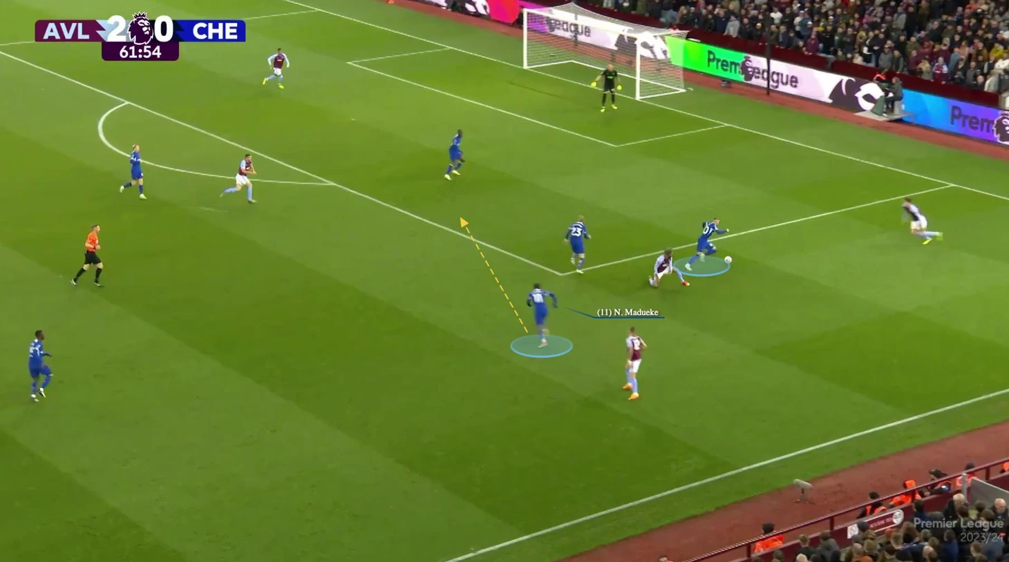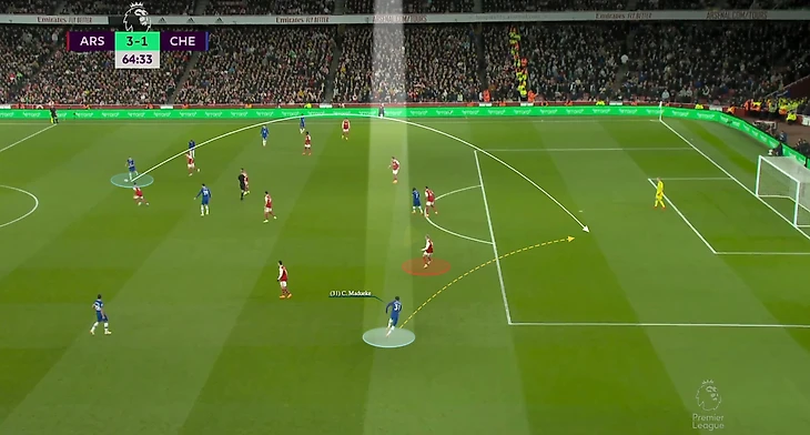 Условно говоря, U10-комбинация. Но если работает — зачем усложнять? С Палмером это происходило регулярно. Томиясу в одном из матчей вроде бы прочитал рывок — но не успел. Это частая история с Мадуэке: даже когда защитник знает, что будет, остановить не может. Взрывной старт — даёт нужный отрыв, и дальше уже не догоняют.