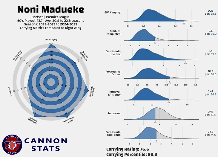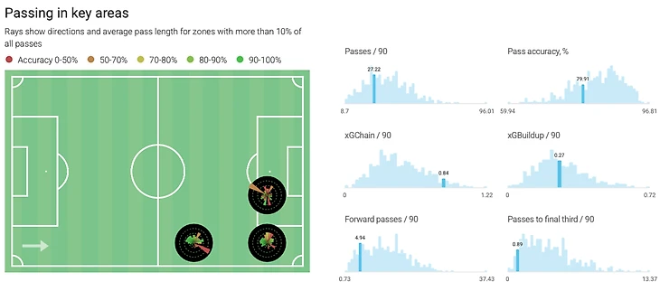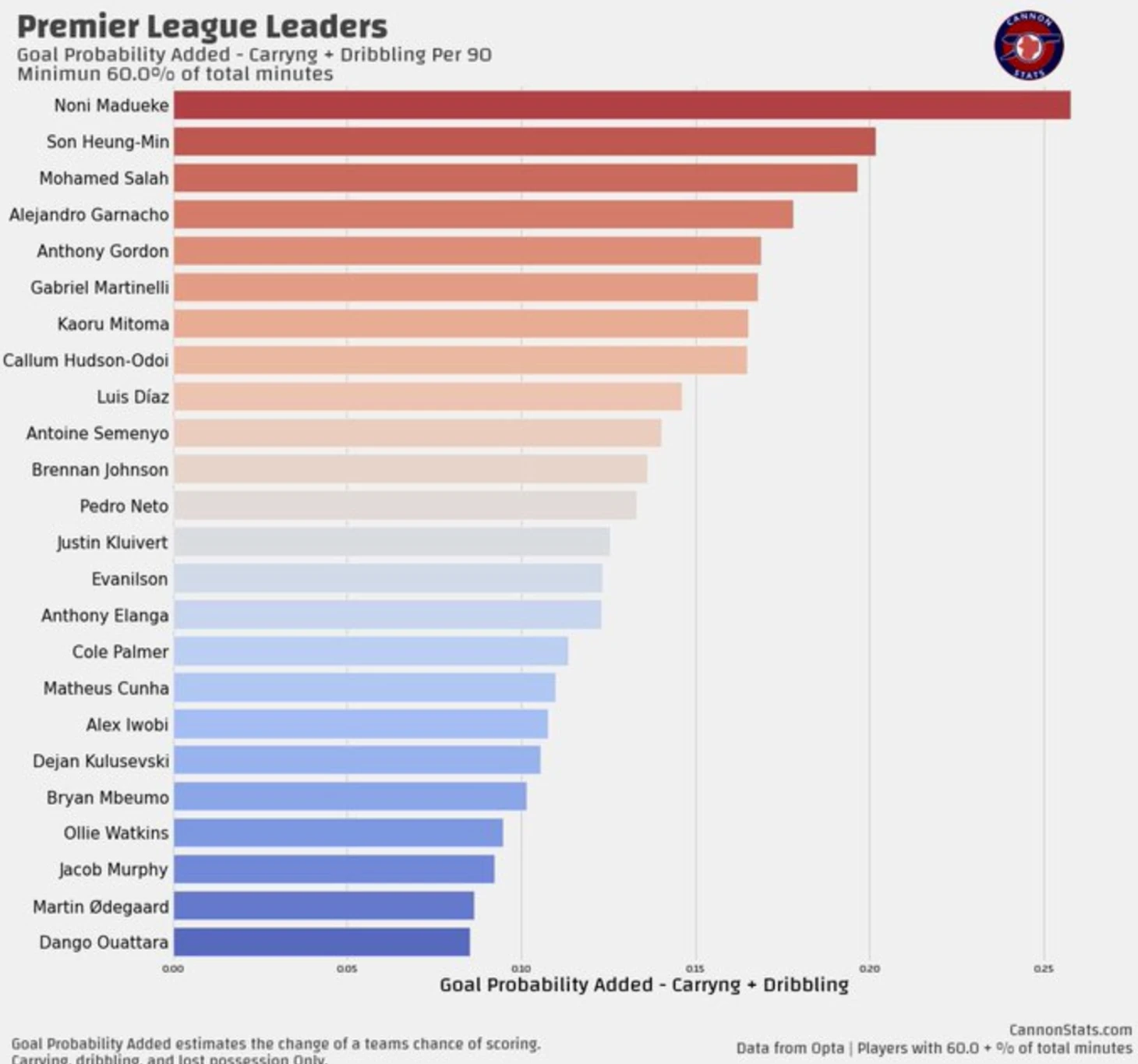 Он — вингер, который бьет чаще всех в лиге (3.54 удара за 90 минут), лидирует по количеству прогрессивных продвижений мяча среди всех игроков с хотя бы 20 сыгранными матчами, и при этом превращает эти продвижения в удары лучше остальных.