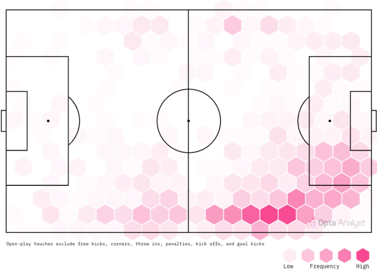 Роль в системе — довольно прямолинейная. На правом фланге — ширина, мяч, тащи. Иногда смещался налево — особенно в концовке сезона, было 5 стартов после апреля. Подробности разберём позже, но общее правило: с права — бьёт, слева — больше комбинирует.