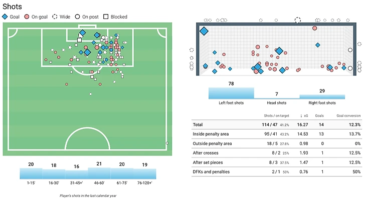 Он постоянно попадает в штрафную: это не игрок, который торчит на бровке и ждёт паса. Он идёт внутрь, обыгрывает, двигается, набирает — и потом пробивает. Почти все удары он генерирует сам: обыграл, освободил ногу, пробил.