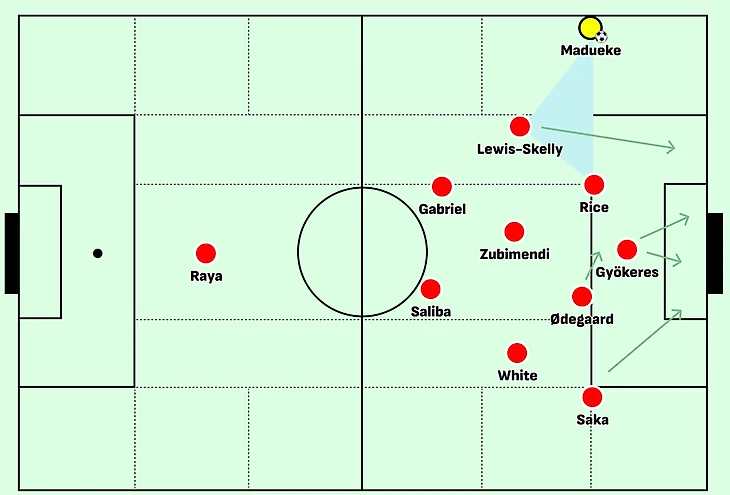 Принятие решений: Здесь пока заметная разница с тем же Сака. Мадуэке делает то, что в голове — вне зависимости от ситуации. Это добавляет смелости, но иногда отнимает результативность.