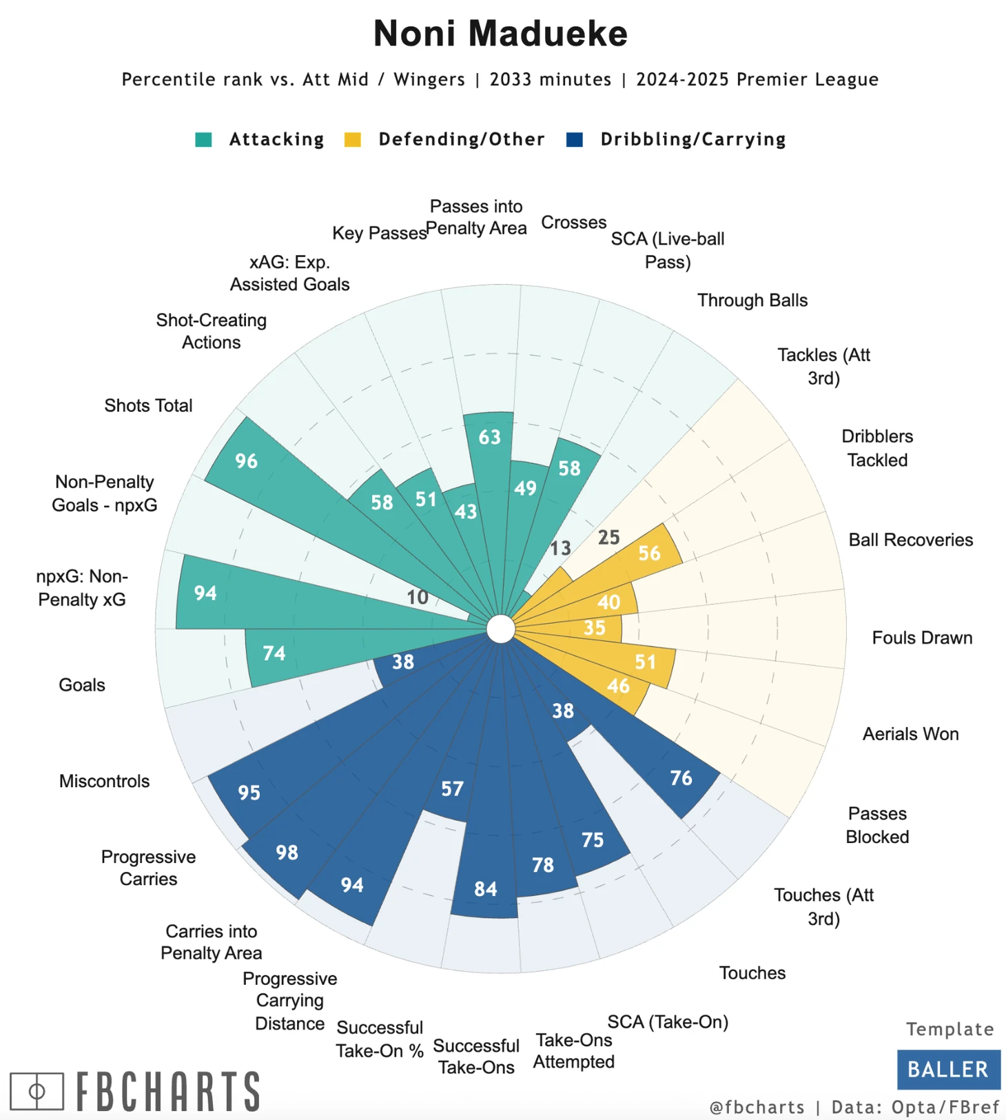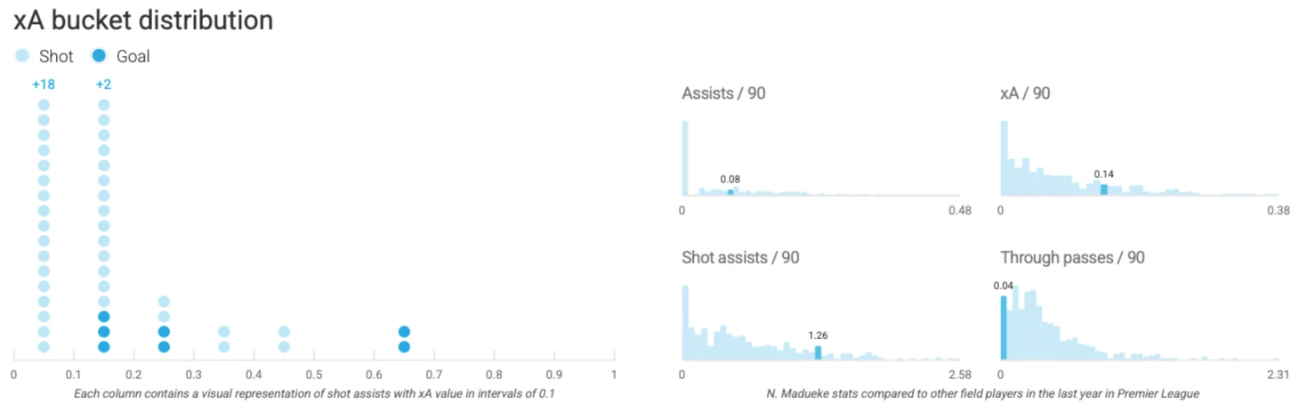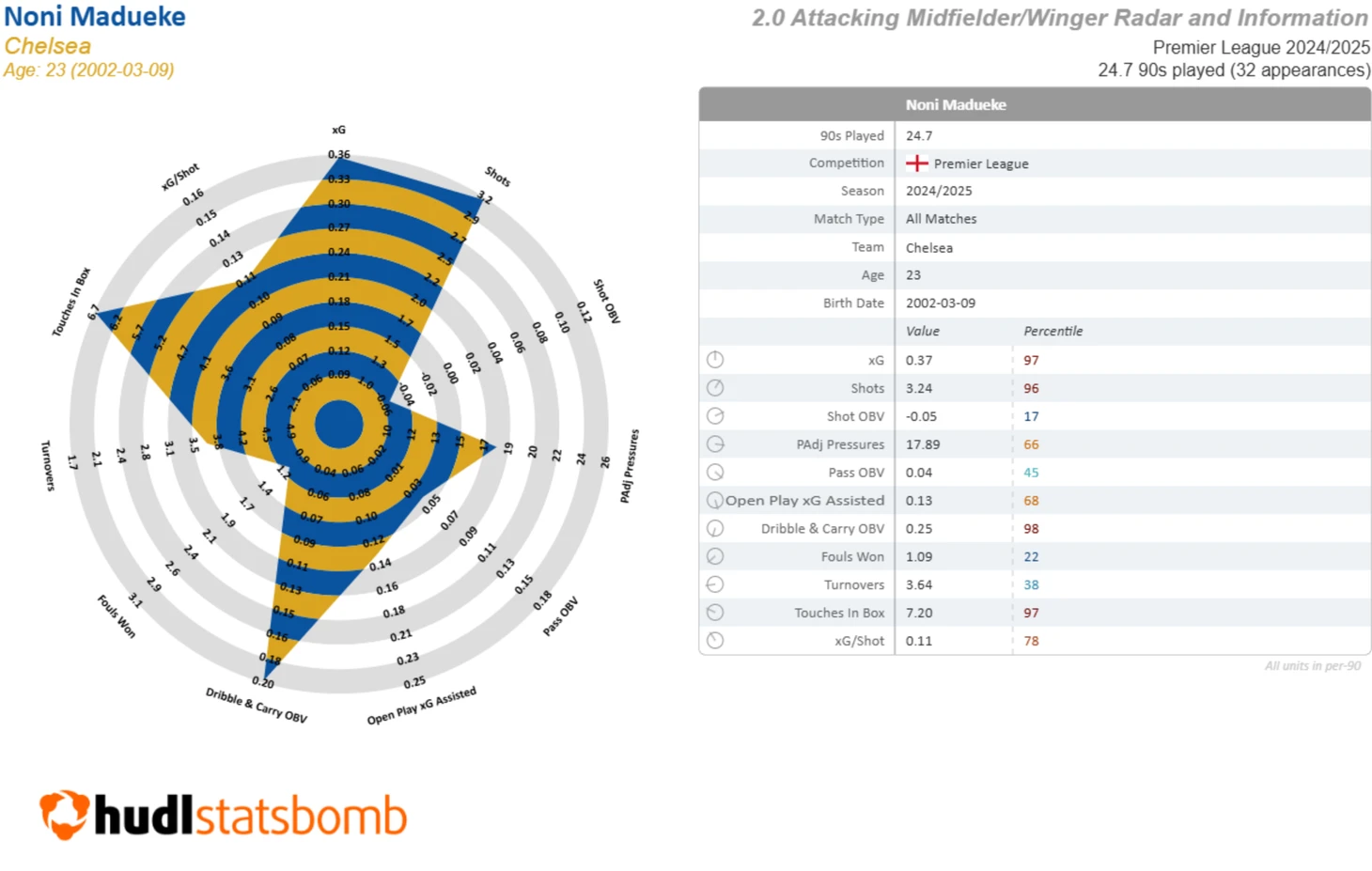 Если смотреть на цифры по сезону — у Мадуэке профиль довольно специфичный, но читаемый.
