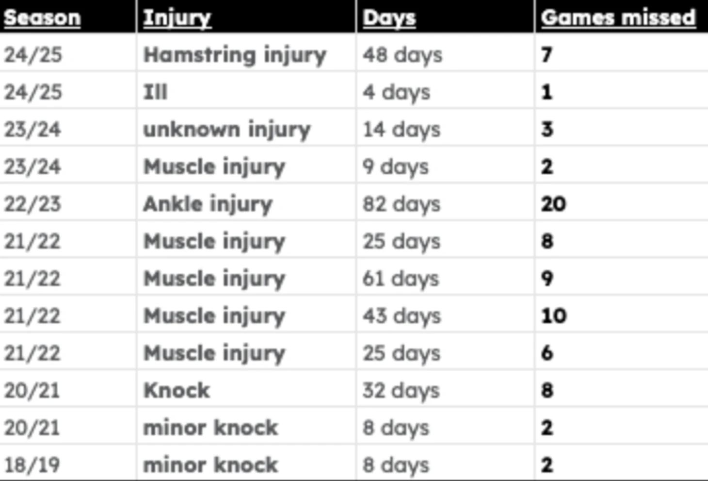 У Мадуэке история с мышечными травмами: особенно тяжёлый сезон был в 2021/22, когда он вылетал по 3–4 раза и провёл больше 150 дней вне состава. Тогда каждый камбэк заканчивался новой паузой.