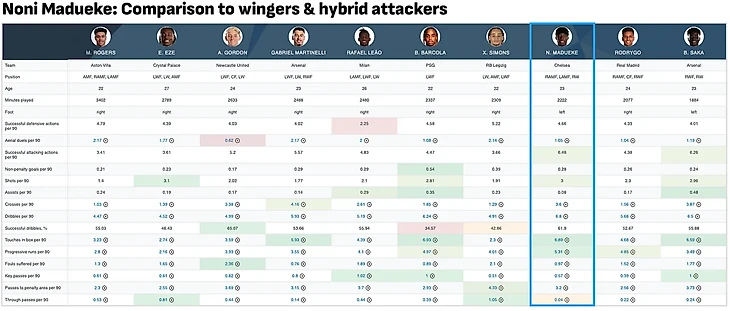 Если сравнивать с похожими игроками (в том числе с Сака и Мартинелли), видно следующее: