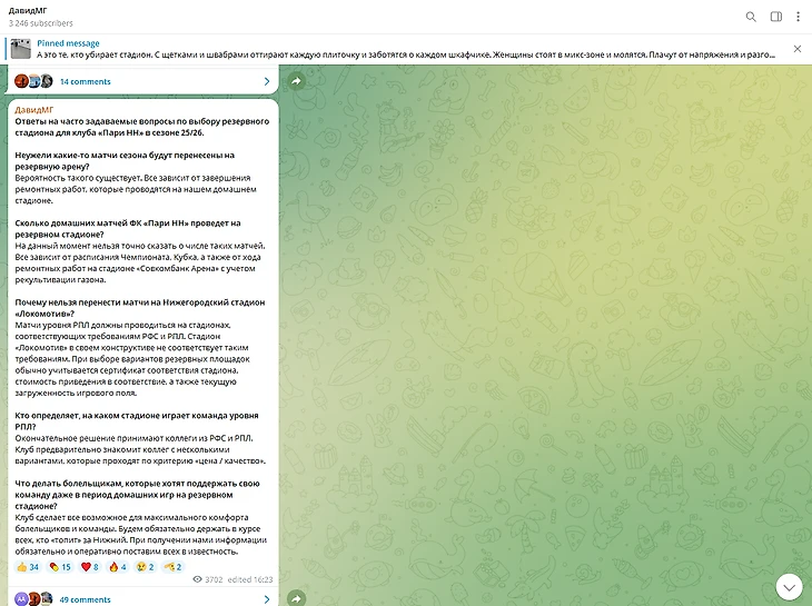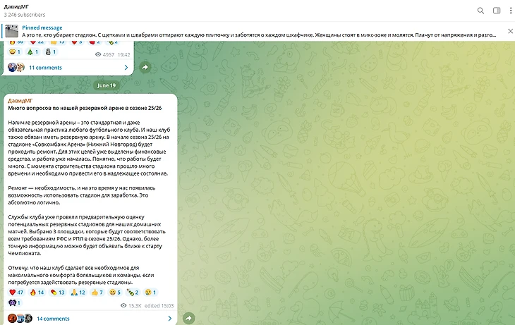 Уже конец июля, а все-таки до сих пор непонятно, почему “Пари НН” не играет домашние поединки в Нижнем Новгороде. 19 июня 2025 года генсек РФС Маским Митрофанов сообщил, что руководство нижегородцев запросило возможность проведения первых домашних 2-4 матчей сезона на резервной арене. Генеральный директор клуба Давид Мелик-Гусейнов в этот же день опубликовал в своем телеграм-канале следующий пост.