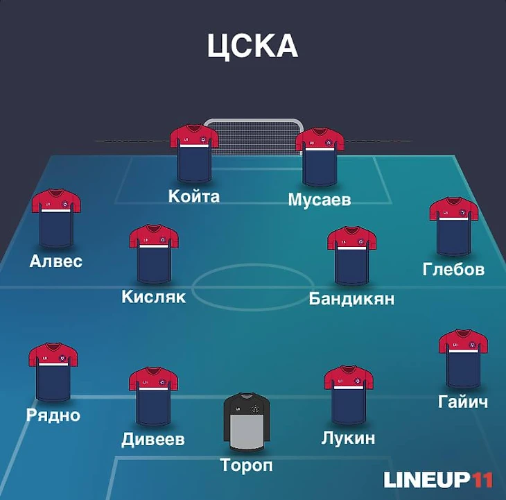Очевидно, что на воротах появится Тороп, который постоянно играет в Кубке. Роша и Келлвен уже покинули ЦСКА, поэтому справа выйдет Гайич, а в центре Дивееву будет помогать Лукин. Возможно, слева в защите Мойзеса заменит Рядно. В центре поля ситуация сложнее – есть только молодой Бандикян. Доверится ли ему Челестини? На краях атаки выйдут Глебов и Алвес, а в атаке Койта и Алеррандро.