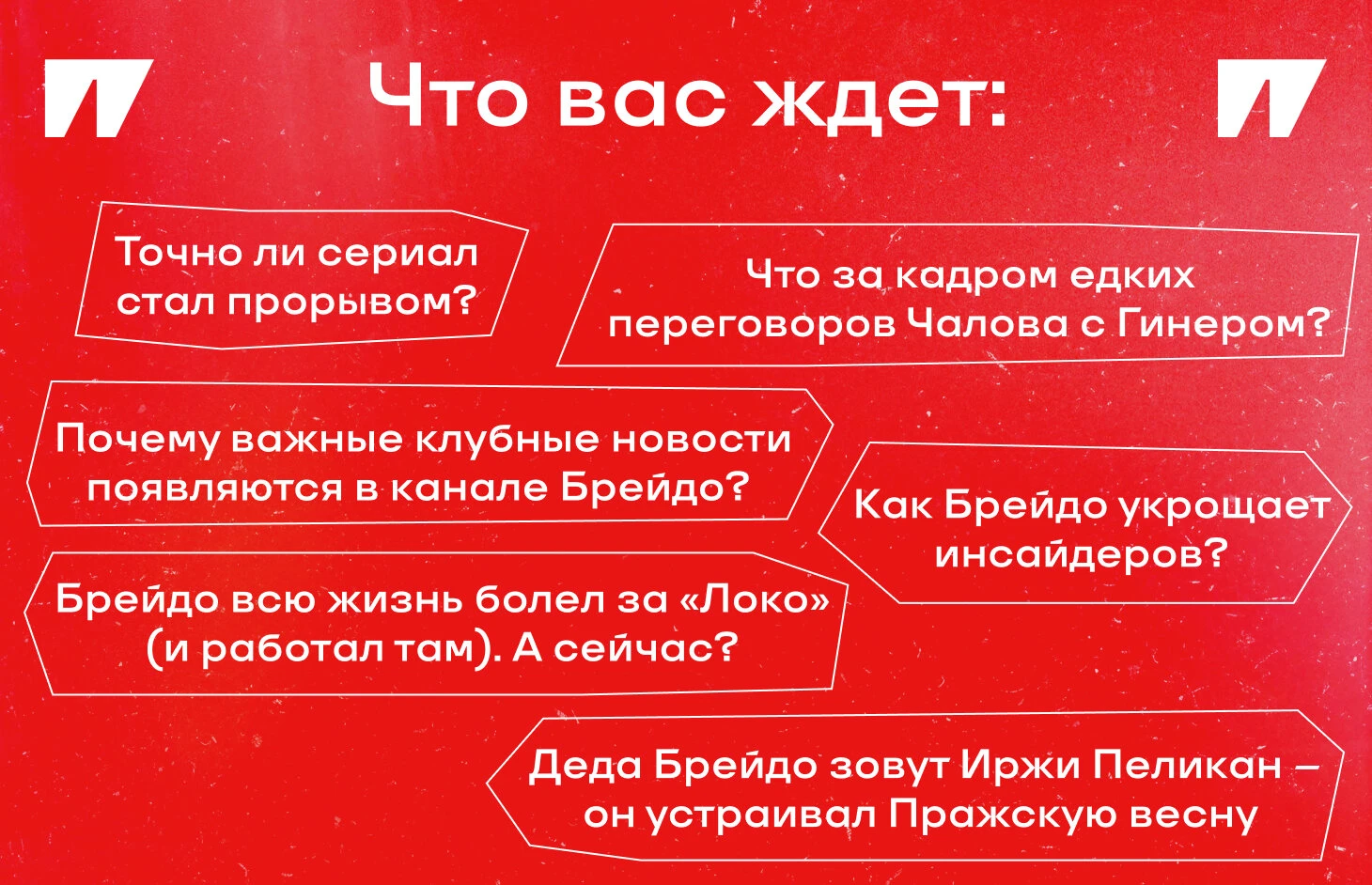Мы начинаем разговор с сериала и уделяем ему большую долю этого интервью по трем причинам. Потому что такой проект – все еще очень редкое для нашего футбола событие. Потому что он наглядно раскрывает роль Брейдо в командных отношениях. И потому что внутри зашиты десятки фактурных сюжетов о жизни ЦСКА. Читать разговор про сериал комфортно, даже если вы его не смотрели.