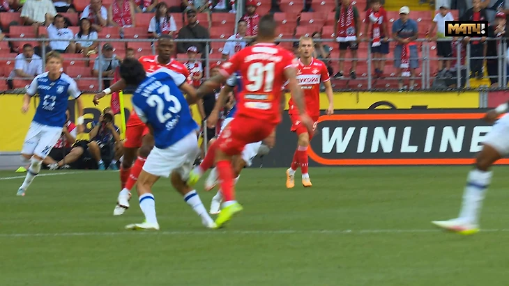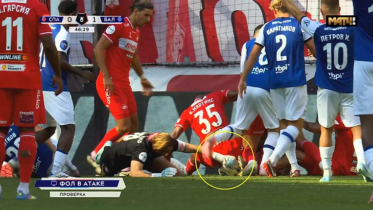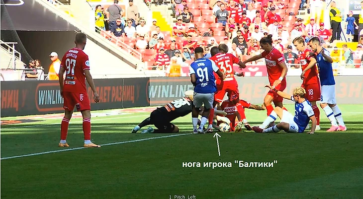 Теперь переходим к спорным моментам, которые были трактованы не в пользу «Балтики», в первую очередь конечно речь пойдет о незасчитанном голе. Кратко опишем эпизод: в ходе атаки «Балтики» в штрафной «Спартака» возникла суматоха, в ходе которой мяч оказался в сетке ворот красно-белых.
