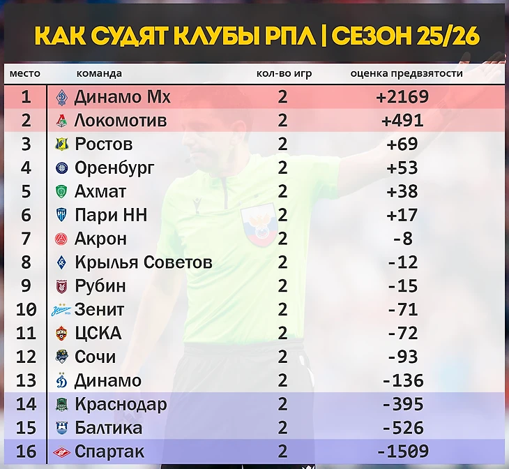 В прошедшем туре громких судейских скандалов на 1000+ баллов не было, что очень хорошо. Учитывая события прошлого тура, неудивительно, что в ярких зонах остались «Спартак» и Махачкала. По большей части команды судят нейтрально, но все еще наверняка изменится.