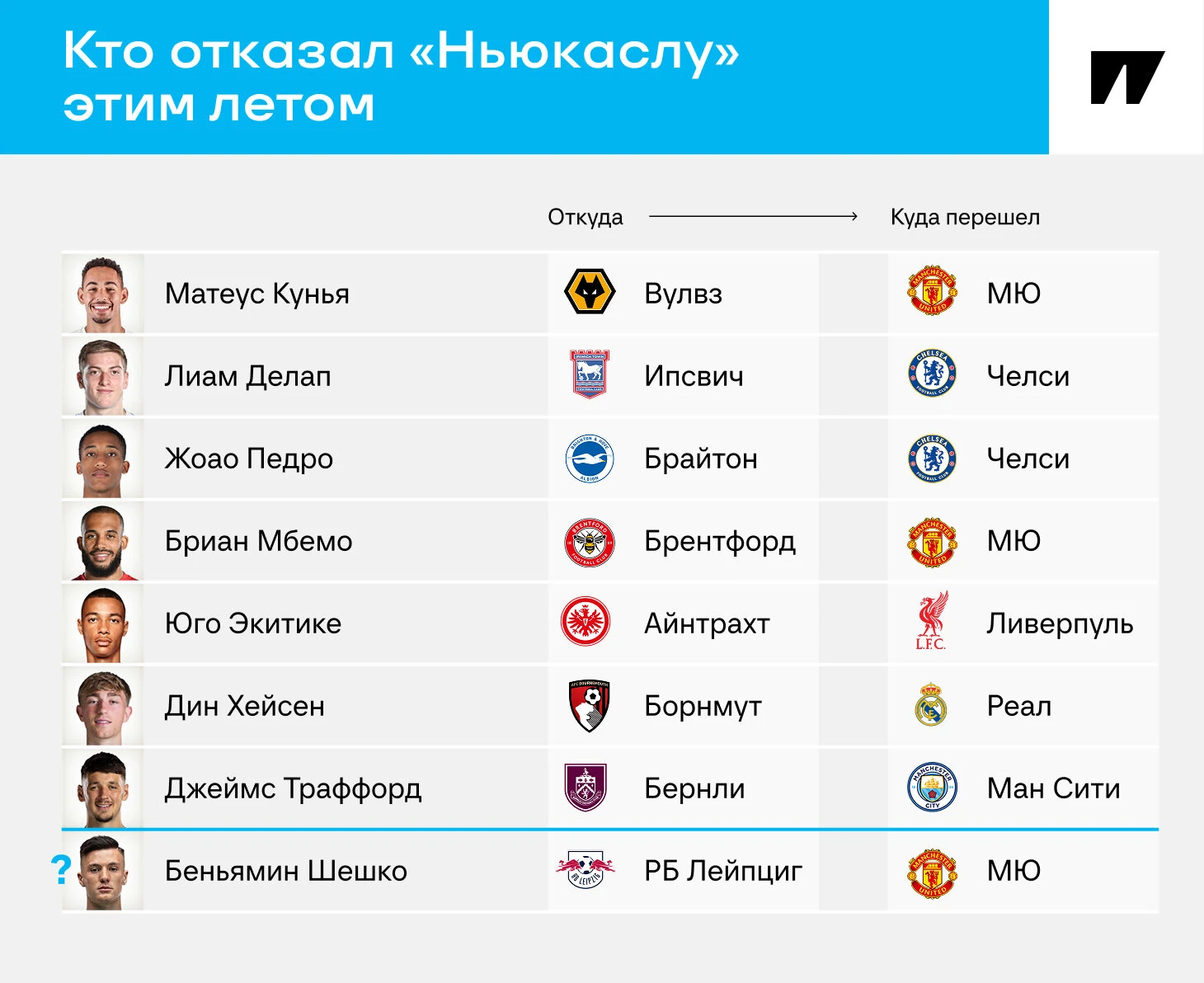 ❌ Таким нападающим мог бы стать Беньямин Шешко из «РБ Лейпциг», который у большинства топ-клубов в начале лета был запасным вариантом на случай срыва основных целей (Виктора Дьокереша, Юго Экитике, Жоао Педро и других). «Ньюкасл» предметно общался с представителями игрока и немецкого клуба − но вы уже догадываетесь, что произошло.