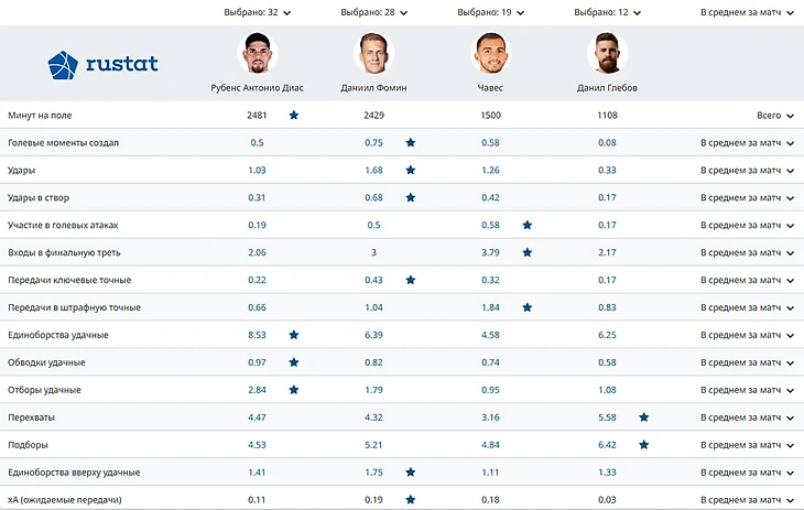 Интересно будет посмотреть, куда универсального игрока поставит Валерий Карпин. С одной стороны, у «Динамо» уже полностью укомплектована тройка полузащиты: вряд ли главный тренер сборной России посадит на скамейку Глебова, Фомина или Бителло. Однако здоровое соперничество между футболистами никогда не помешает, тем более что сейчас в лазарете находится Луис Чавес. Рустат представил любопытное сравнение средних статистических показателей Рубенса с другими динамовскими полузащитниками за прошлый и текущий сезоны, по которому можно сделать выводы, что бразилец - игрок гораздо более оборонительного плана, нежели Чавес или Фомин. Зато у новичка, на ряду с Глебовым, лучше защитные показатели, а по удачным отборам, обводкам и единорствам он и вовсе лидирует в этой компании. Не сильно отстаëт от конкурентов и по среднему количеству перехватов, успешным верховым единоборствам и ожидаемым ассистам.