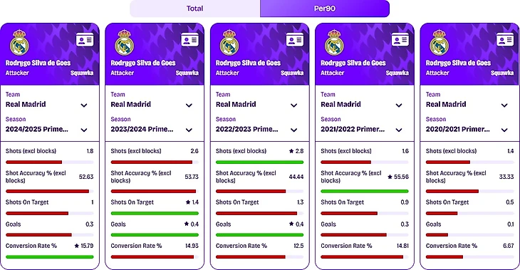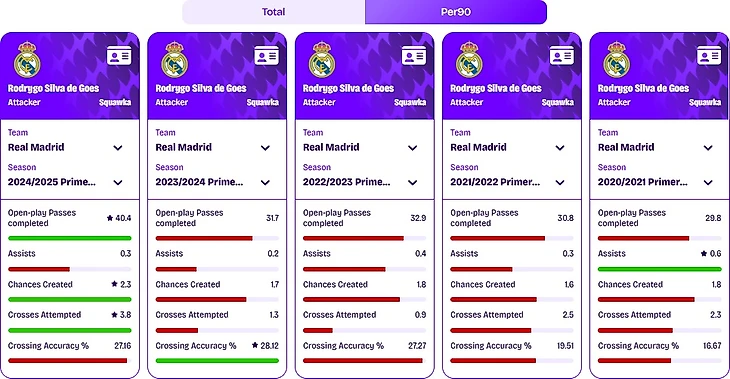 Тот же дебютный сезон (2020/21) оказался рекордным по ассистам — 0,6 за 90 минут, хотя небольшое количество сыгранных минут могло исказить статистику. В остальных сезонах Родриго стабильно выдавал ~0,3 голевых паса за матч, с небольшим всплеском в 2022/23 (0,4).