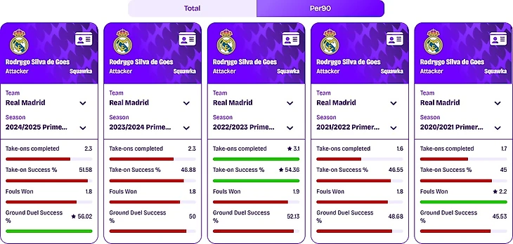 Параллельно росла и его физическая готовность: если в 2020/21 он зарабатывал рекордные 2.2 фола за матч (чему способствовали многочисленные подкаты соперников уже после его проходов), то в последние сезоны этот показатель стабилизировался на отметке около 1.8. Зато в наземных единоборствах Родриго совершил качественный скачок - с скромных показателей в начале карьеры до впечатляющих 56.02% победных единоборств в прошлом сезоне.