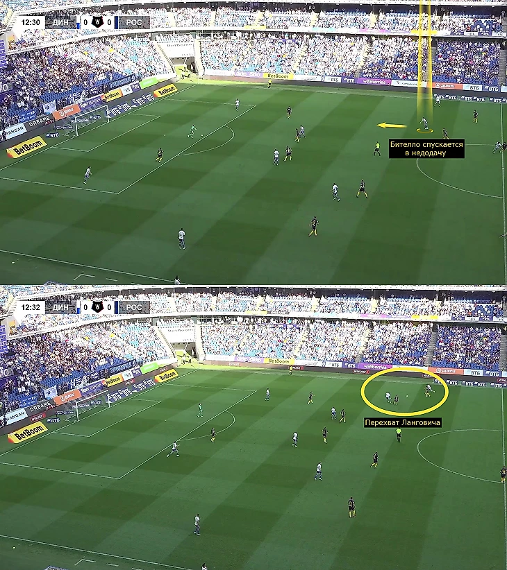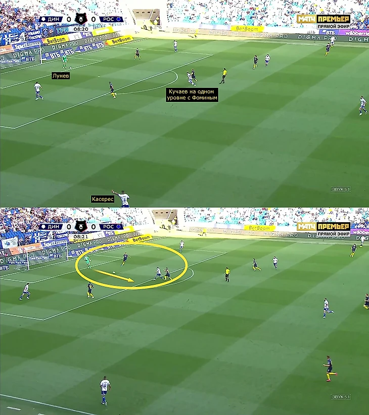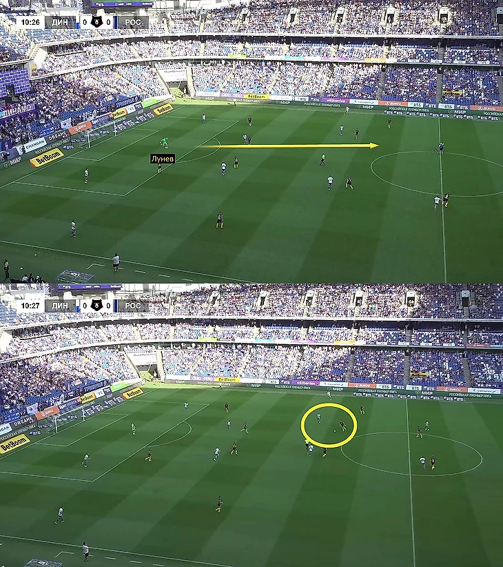 Например, против «Ростова» Лунев снова выкатил Фомину, хотя правый защитник был Касерес в более выгодной позиции. В итоге Константин Кучаев едва не накрыл Фомина – мяч ушел от него за лицевую. Атакой ранее Лунев тоже не видел Касереса, почти десять секунд владел мячом, а после едва не обрезал левого защитника Александра Кутицкого.