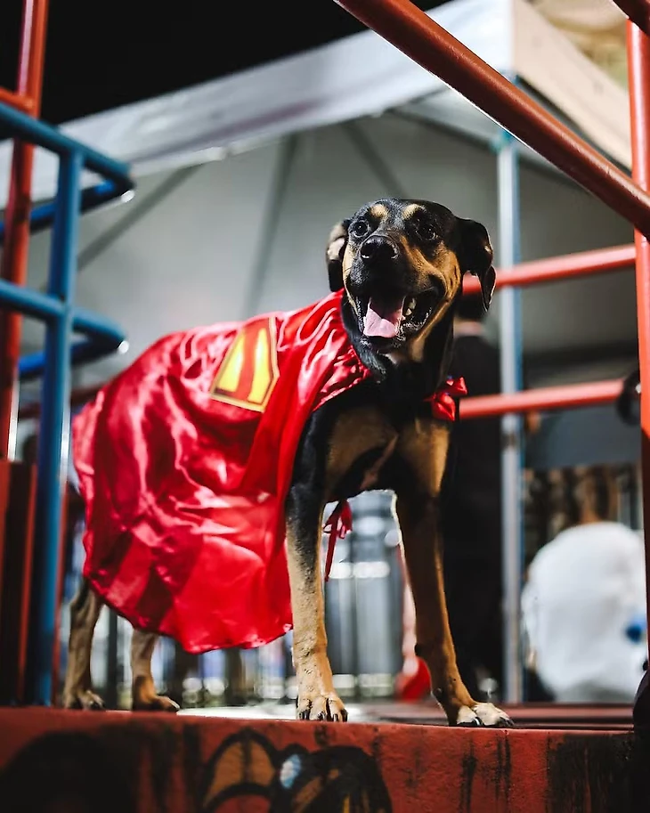 На футболистов надели футболки со значком Супермена, а четвероногих нарядили в костюмы Крипто – собаки супергероя из комиксов и нового фильма.