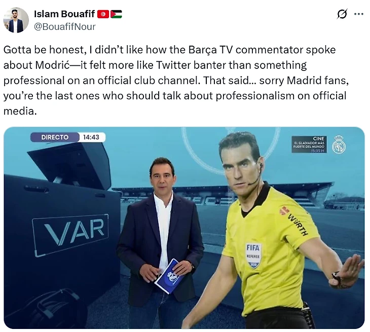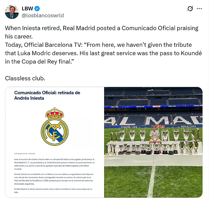 «Когда Иньеста завершил карьеру, «Реал» опубликовал официальное заявление, в котором восхвалял его карьеру. Сегодня официальное ТВ «Барселоны» сказало такое о Модриче. Клуб без класса».