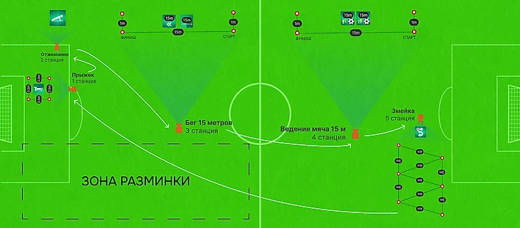 После этого юные игроки отправились отдыхать и обедать, а специалист JuniStat размечал поле и готовил станции для второго блока тестов. Вечерний этап включал в себя следующие упражнения:
