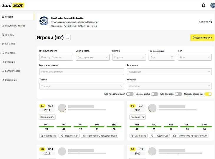 Поэтому в Казахстане продолжают внедрять технологии. Так, например, на отборе в юношескую сборную U15 КФФ применяли тестирование на основе искусственного интеллекта от JuniStat.