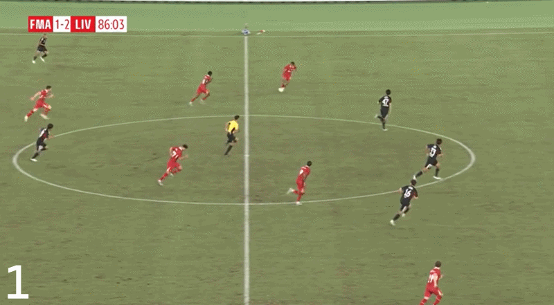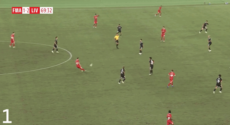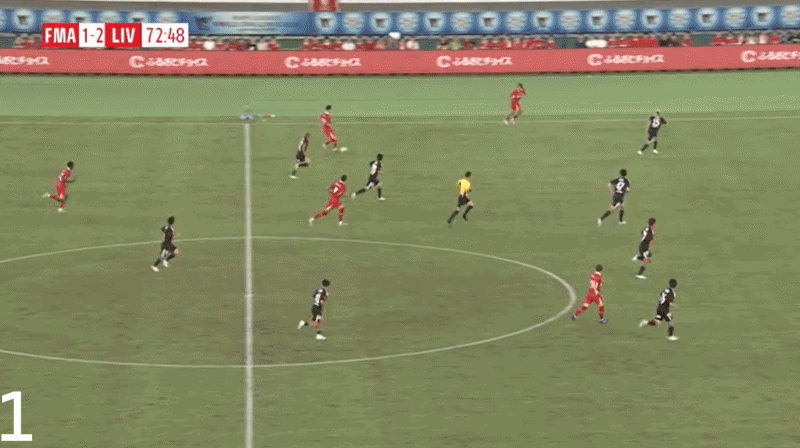 Когда «Ливерпуль» перешел в контратаку, Нгумоа прошел вперед почти от средней линии и продемонстрировал свою уверенность в том, что удерживает мяч, а не использует кого-либо из своих партнеров по команде, ушел от подката Косея Сувамы и пробил выше ворот Реи Кимуры.