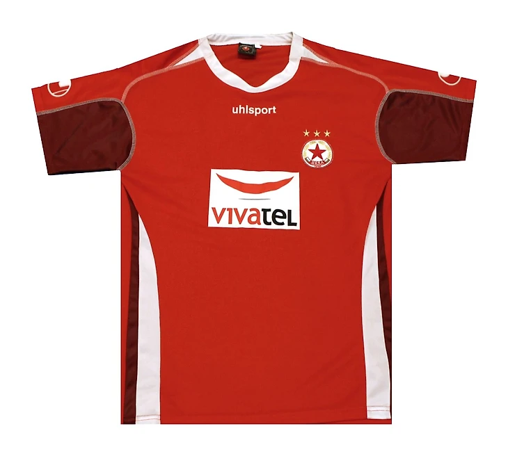 Опять же, помог сайт Football Kit Archive – там можно посмотреть формы всех участников турнира в конкретный год. Удача улыбнулась в третьем по счету сезоне, 2005/06 – там я наткнулся на домашнюю форму софийского ЦСКА от Uhlsport, у которой был и нужный воротник, и схожие белые линии, и спонсор практически как на фото с Кузей.