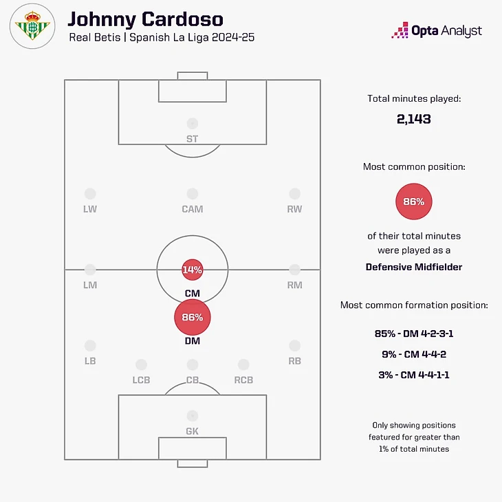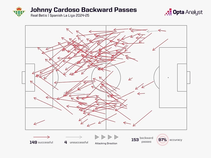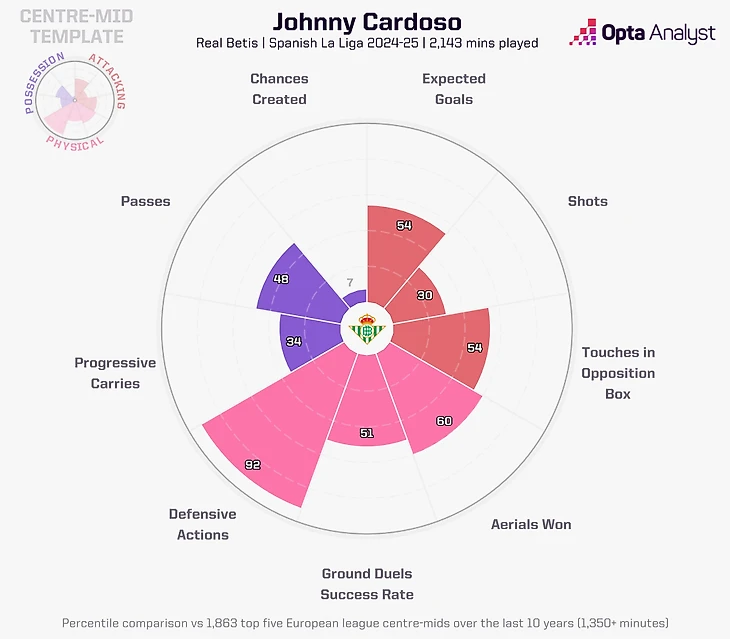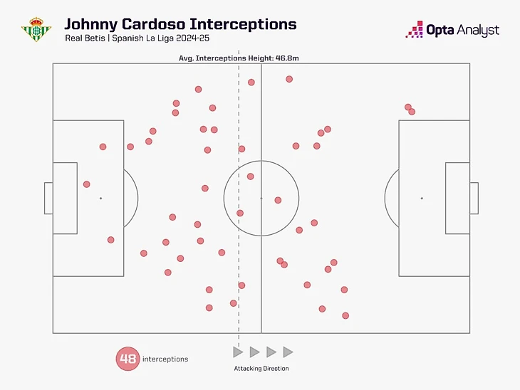 Креативная статистика Кардозо не бросается в глаза — и это ожидаемо. В «Бетисе» роль главного плеймейкера выполнял Иско. Сам же бразилец действовал в паре с другим опорником, где его основной задачей была прикрытие обороны, а не организация атак. Пока Антони, Иско и компания отвечали за творческую составляющую, Кардозо обеспечивал структурную устойчивость команды.