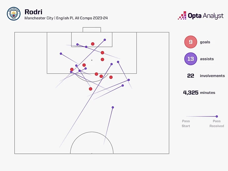 Безусловно, он критически важен для позиционного стиля «Сити»: 3359 успешных передач в сезоне-2023/24 — рекорд АПЛ за одну кампанию (как минимум с 2003/04).