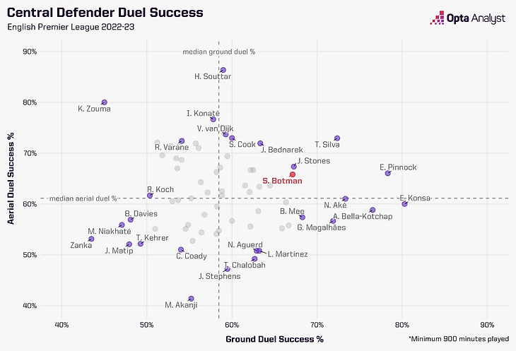 Достаточно сказать, что в сезоне-2022/23 (своём единственном полноценном сезоне в АПЛ) он вошёл в четвёрку центральных защитников (сыгравших 900+ минут), выигравших не менее 65% верховых (65,8%) и наземных единоборств (67,1%).
