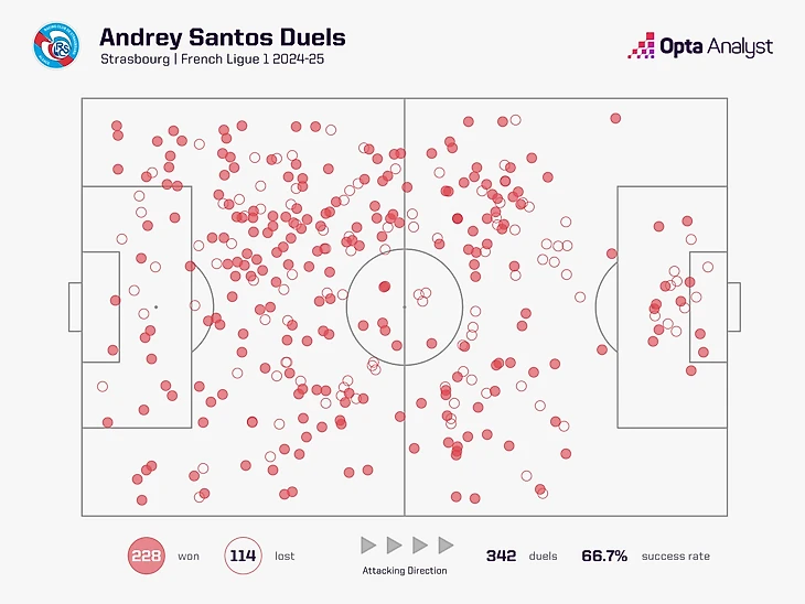 Андре Сантос не ограничивался разрушительной работой – он стал настоящей атакующей угрозой для «Страсбура». В сезоне-2024/25 бразилец забил 10 голов в Лиге 1 (второй результат в команде) и создал 29 голевых моментов с игры (также второй показатель). Эти цифры впечатляют ещё больше, если учесть его позицию опорного полузащитника.