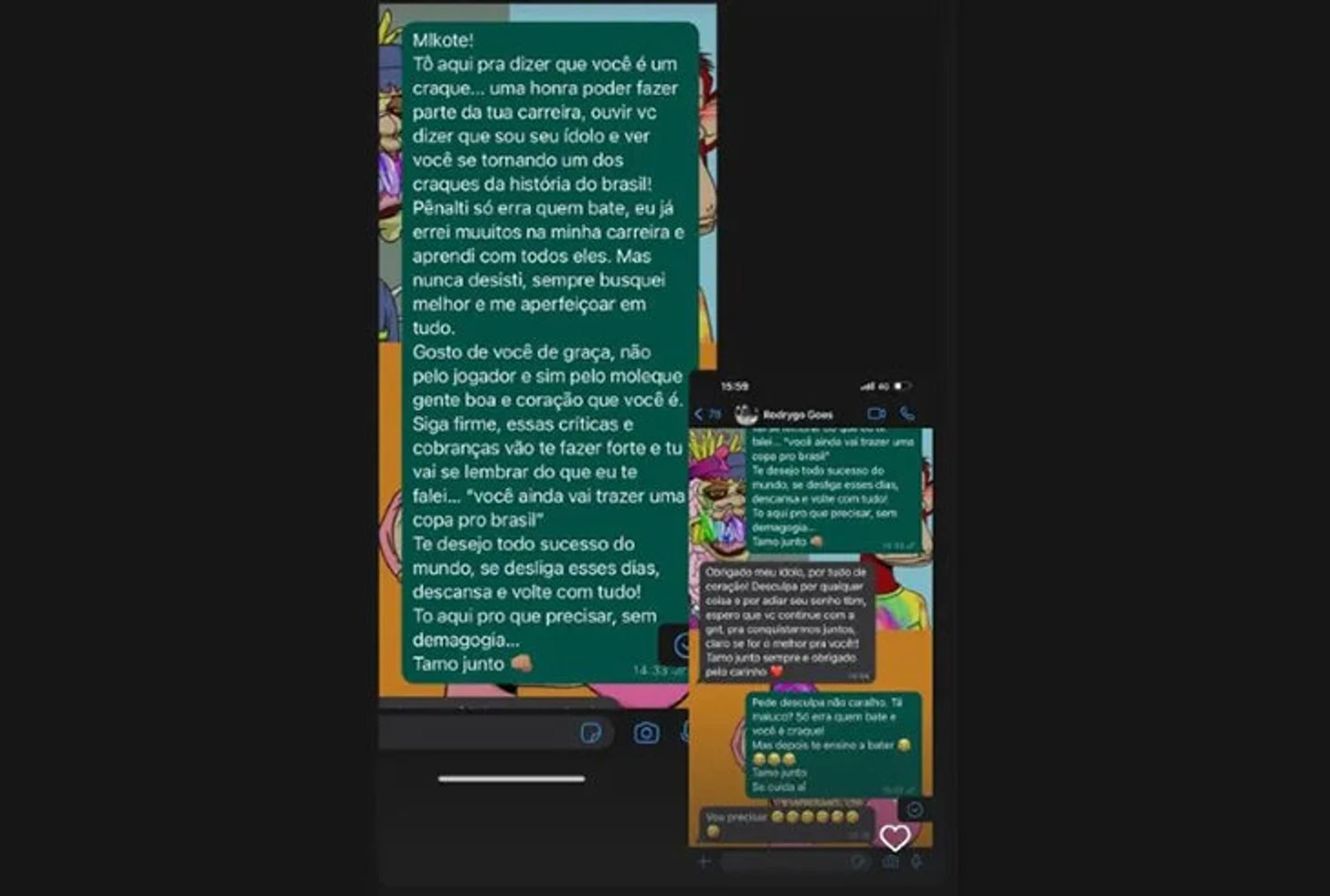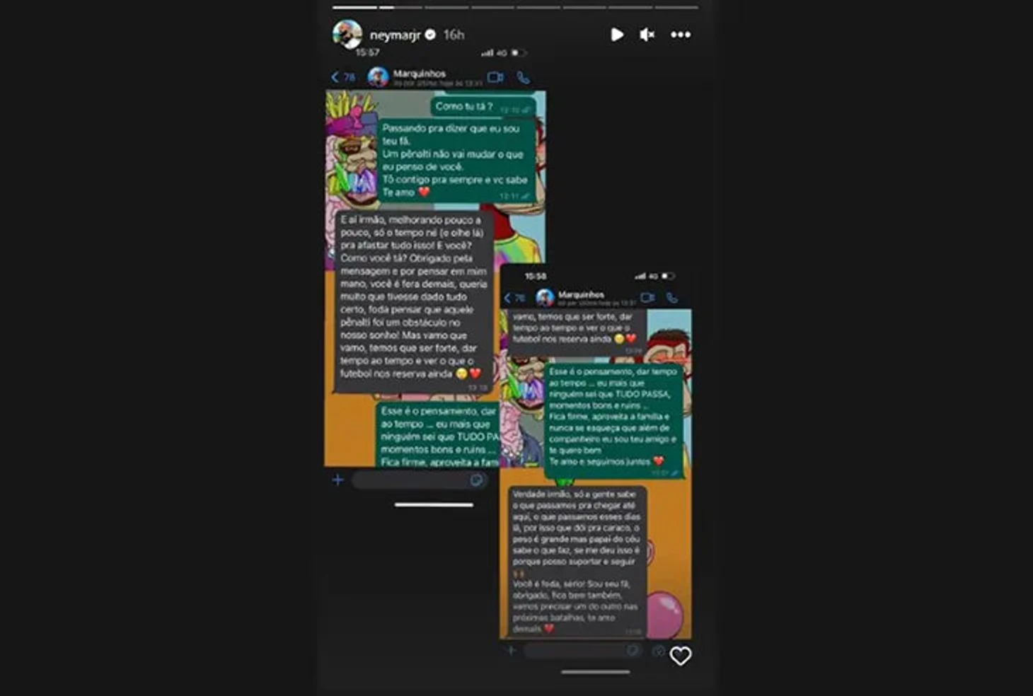 ● В неудобное положение из-за вотсапа попал Неймар после вылета с ЧМ-2022: чтобы продемонстрировать единство сборной Бразилии он выложил скрины переписки с партнерами – Маркиньосом, который не забил пенальти в серии с Хорватией, Тиаго Силвой и Родриго.