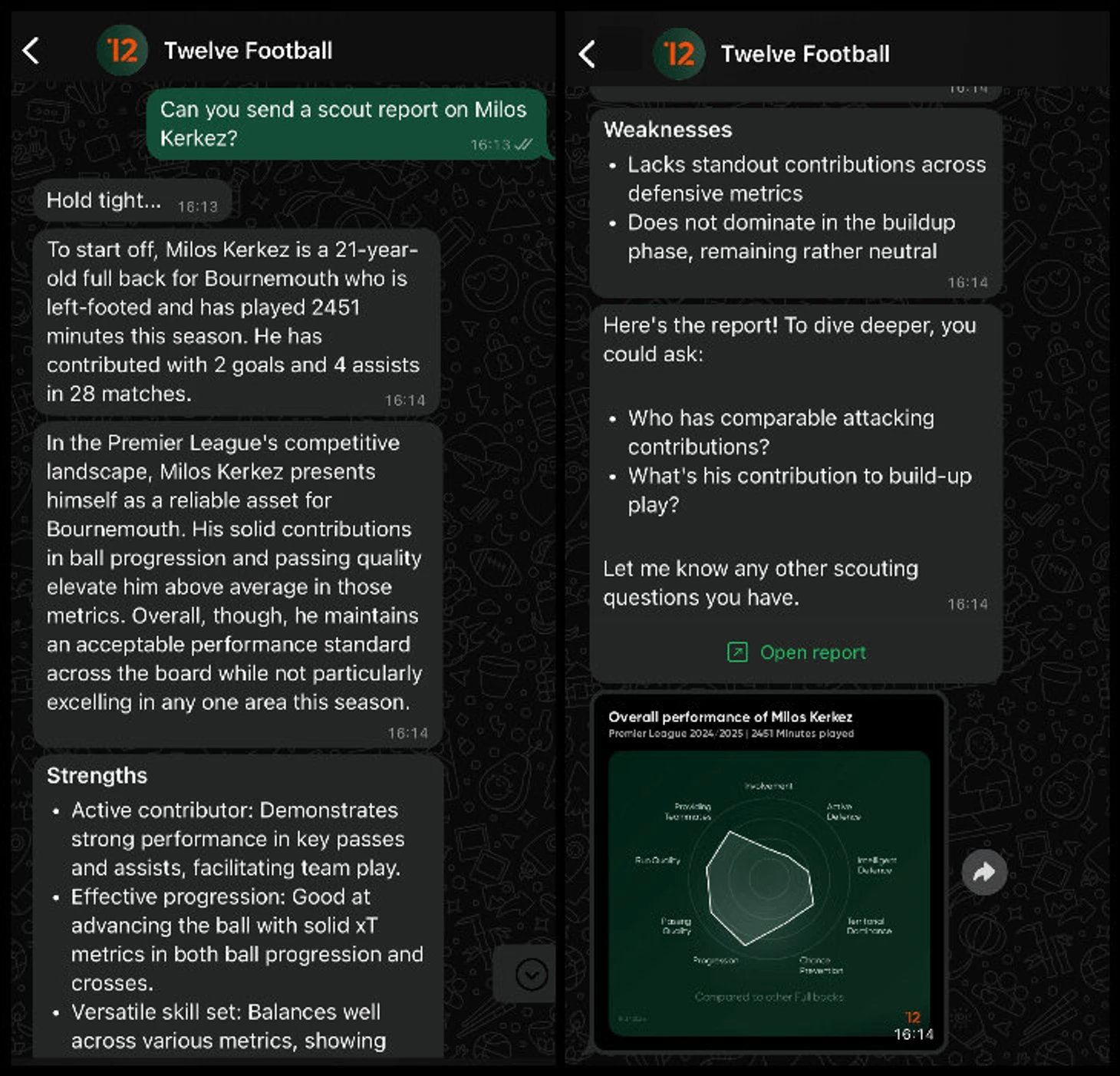 Дело в том, что с ним интегрирован основанный на ИИ сервис Earpiece от компании Twelve Football. Он работает как бот: пользователь пишет сообщение с запросом на анализ конкретного игрока и получает отчет о его стиле со статистикой.