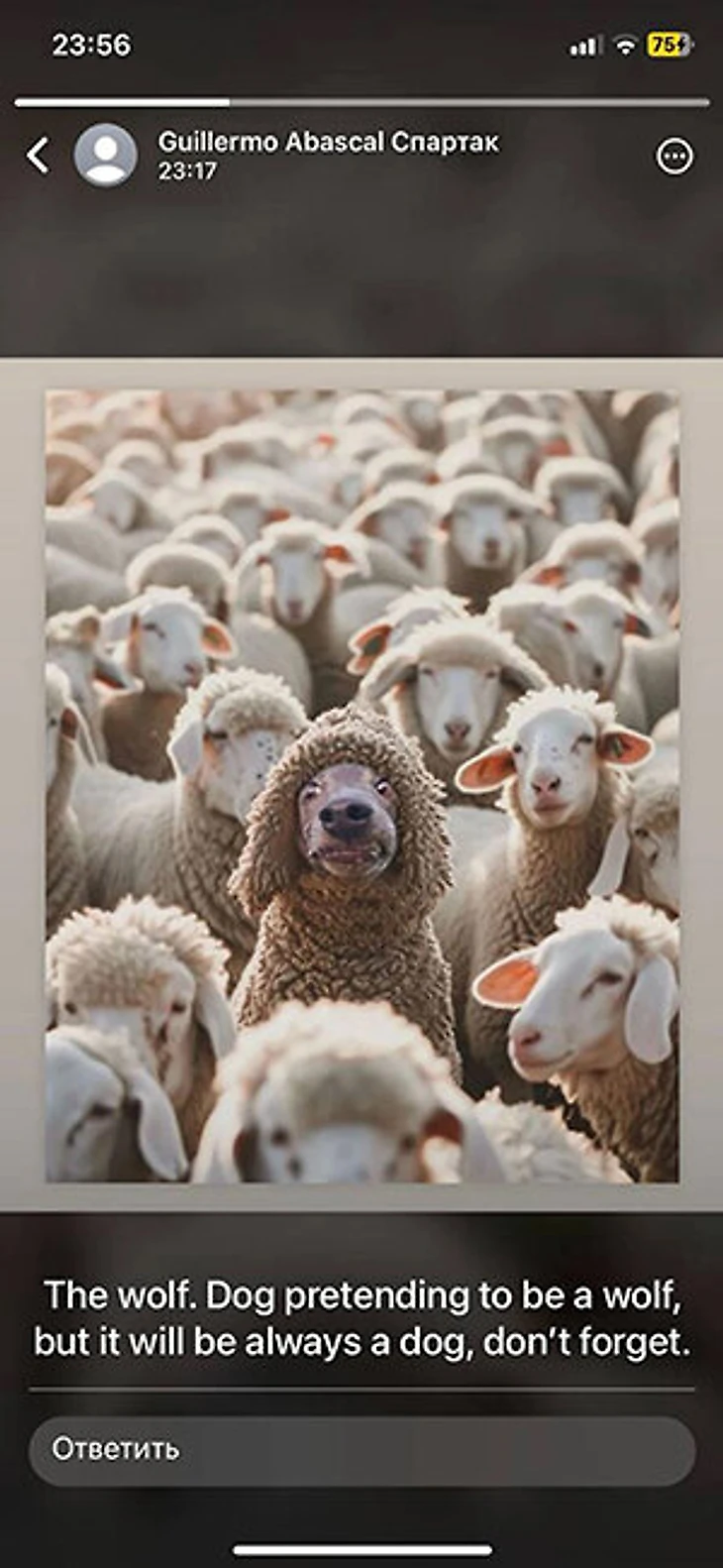 ● За месяц до увольнения из «Спартака» в вотсапе по-философски отметился Гильермо Абаскаль. «Волк. Пес может прикинуться волком, но всегда будет оставаться псом, не забывайте», – написал главный тренер «Спартака» в историях.