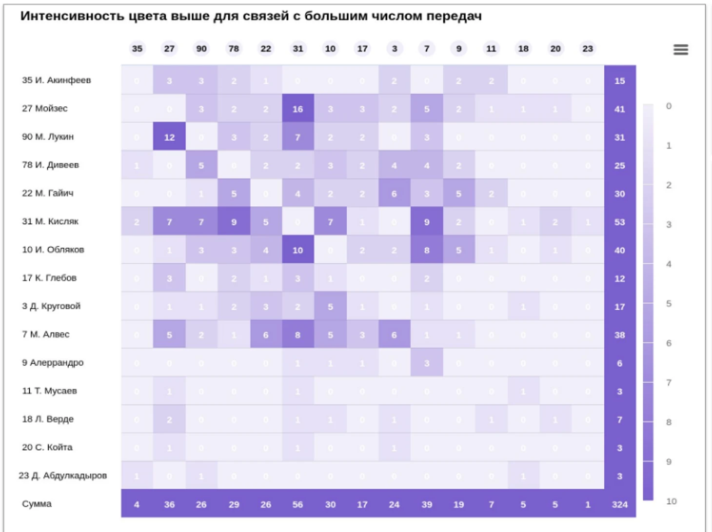Если говорить о более высоких оборонительных структурах — вариациях расположений при прессинге, то с построением и перемещением в таких ситуациях у игроков центральной оси “Зенита” не возникало. В большинстве было достаточно высокое давление, с грамотным уплотнением нужных зон и своевременный разворот при асимметричном расположении, при повороте структуры 4-3-3. В ответ на что полузащитники “ЦСКА” изменяли позицию и дополняли вариации с их участием спуском одного из нападающих, ситуативно такие розыгрыши были успешны (с выходом через центр), но в большинстве роль этих игроков была промежуточной, как и при участии в продолжении владения через мяч, так и при участии через позиционное занятие пространства — в основном больше были востребованы и задействованы ключевые продвижения через фланг. Карта ниже - хорошо показывает вовлеченность полузащитников во владения в структурах “армейцев” как разные варианты (таблицу можно отнести, как и к фазе более высокого владения), так и розыгрыша на своей половине).