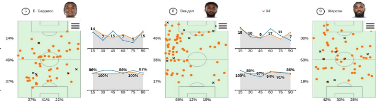 Это хорошо показывает карта действий (если смотреть на деяния на чужой половине) - у Барриос больше действий в центральном коридоре, у Вендела - перекос на левый фланг, у Жерсона - разнообразное количество.