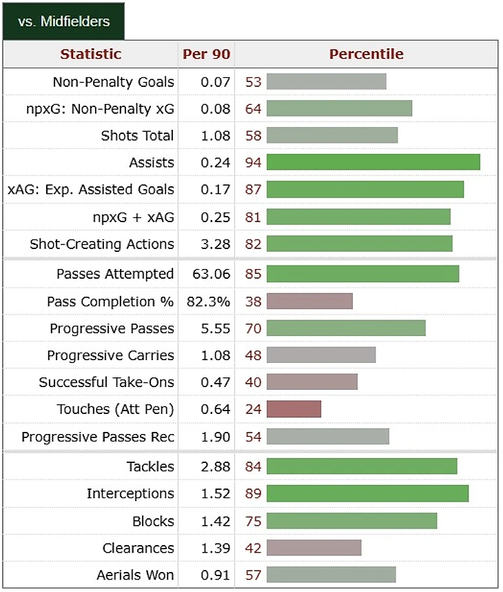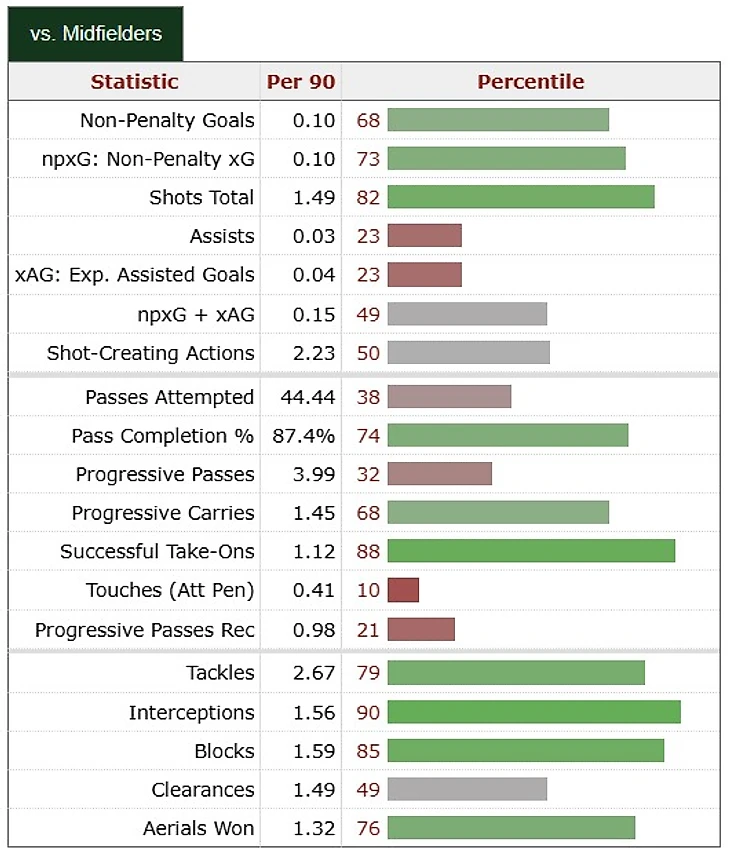 Хорош в обороне примерно во всём - отборы, перехваты, борьба в воздухе, что подтверждается статистикой, игрок высоко во всех категориях;