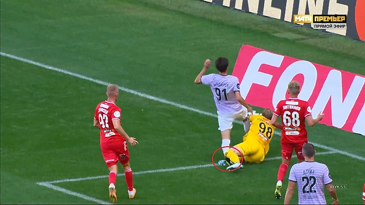 Первый пенальти в ворота «Спартака» также является правильным решением. Максименко попытался выбить мяч из-под ног Болдырева, но задел его левую ногу, после чего тот упал. Момент правда был посложнее, чем карточки Хлусевичу, ведь мяч уже уходил за пределы поля, да и с ракурсом у Кукуяна могли возникнуть проблемы. Поэтому неудивительно, что изначально главный арбитр не поставил пенальти, пришлось включаться видеоарбитрам.