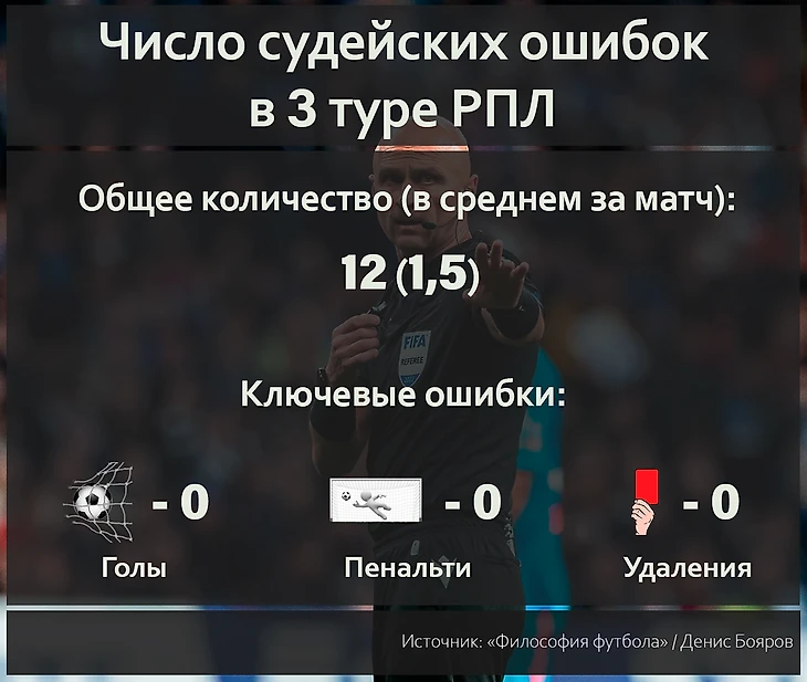 Перед тем, как подвести судейские итоги третьего тура, нам придется сделать шаг назад. Кто меня давно читает, знает, что я скептически отношусь к офсайдным линиям РФС в спорных ситуациях. Во-первых потому что они толстые, а во-вторых потому что при их нанесении все равно большую роль играет человеческий фактор. Поэтому я в спорных ситуациях зачастую сам рисую линии, которые хотя бы потоньше. Таким образом я определил, что в эпизоде с удалением Маркиньоса не зафиксировать офсайд игрока «Балтики» было спорным решением. Однако РФС выкатил разбор момента, и я признаю что был неправ, на сей раз нарисованные линии ЭСК были убедительными, поэтому удаление Маркиньоса — ошибка. Были пересчитаны баллы предвзятости в матче «Спартака» и «Балтики», москвичи оказались в еще более глубоком минусе, а балтийцы чуть отдалились от зоны засуживания.