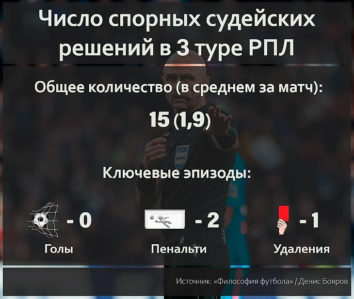 Однако то лишь ошибочные решения, а вот спорных было больше, особенно это касается ключевых эпизодов, таких как пенальти и удаления. Здесь они распределены уже более равномерно, так что под микроскопом мы будем рассматривать не один матч.
