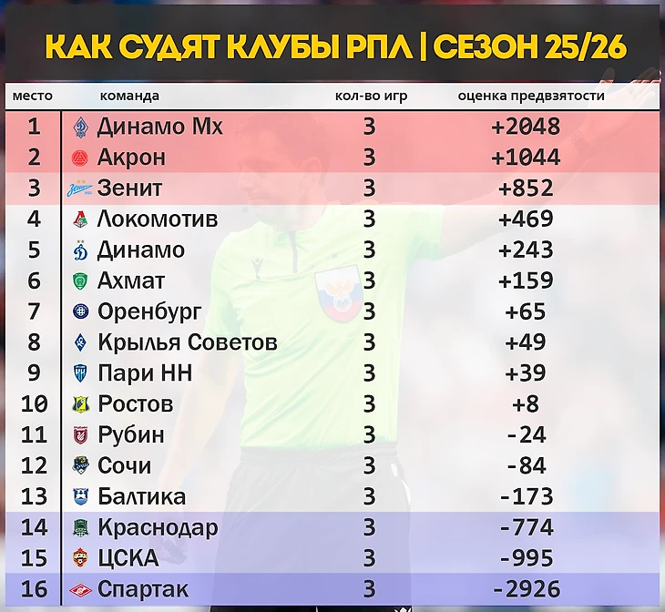 Теперь к таблице предвзятости. В третьем туре на нее в первую очередь повлияли спорные пенальти против ЦСКА и «Спартака», команды прочно расположились внизу как самые главные пострадавшие (особенно красно-белые). В их матчах уровень предвзятости доходил до тысячи баллов, достаточно много, хоть и не катастрофа. Еще в районе 300-400 баллов получили «Динамо» с «Краснодаром», в остальных играх все было спокойно, свистели в обе стороны.