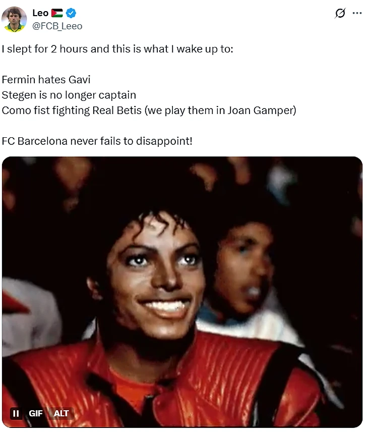 💭 «Я уснул на два часа, а когда проснулся, узнал: Фермин ненавидит Гави, Тер Стеген больше не капитан, игроки «Комо», с которыми мы играем в Кубке Гампера, подрались с «Бетисом». «Барселона» никогда не разочаровывает!»