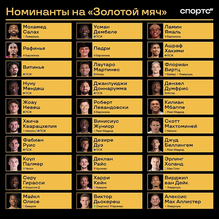 Сегодня французское издание France Football показало список из тридцати номинантов на самую престижную индивидуальную футбольную награду «Золотой мяч». Вот как он выглядит.