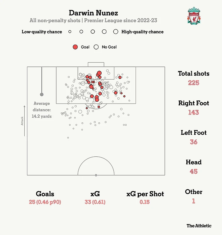 Он целовал свое запястье после каждого забитого гола, напоминая своего соотечественника и предшественника по «Ливерпулю» Луиса Суареса. Когда Нуньес присоединился к команде, была надежда, что он сможет повторить успех Суареса, который забил 82 гола в 133 матчах за клуб за три с половиной сезона с января 2011 по июль 2014 года — и он действительно отлично стартовал.