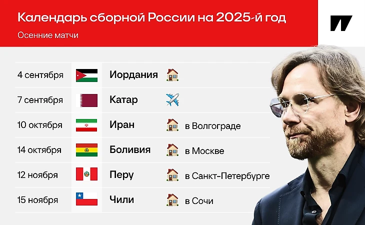 Главный матч осени – против Ирана. Соперник уже отобрался на ЧМ-2026 и идет 20-м в рейтинге ФИФА, выше сборной России (команда Карпина сейчас на 35-м). Встреча пройдет в октябре на «Волгоград-Арене». В марте 2023-го сборные Ирана и России сыграли вничью (1:1) в Тегеране.