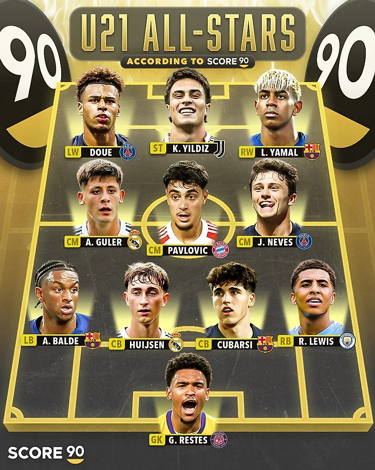 Издание Score 90 создало сборную лучших футболистов, которым еще не исполнился 21 год. Практически каждый из них уже зарекомендовал себя на высшем уровне и считается постоянным игроком старта топ-клуба.