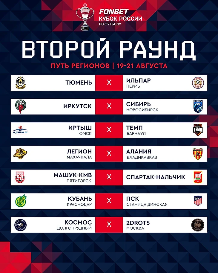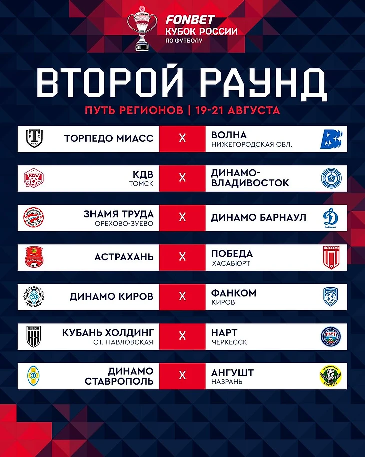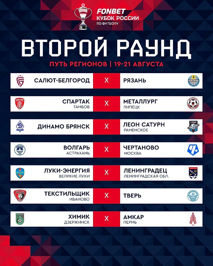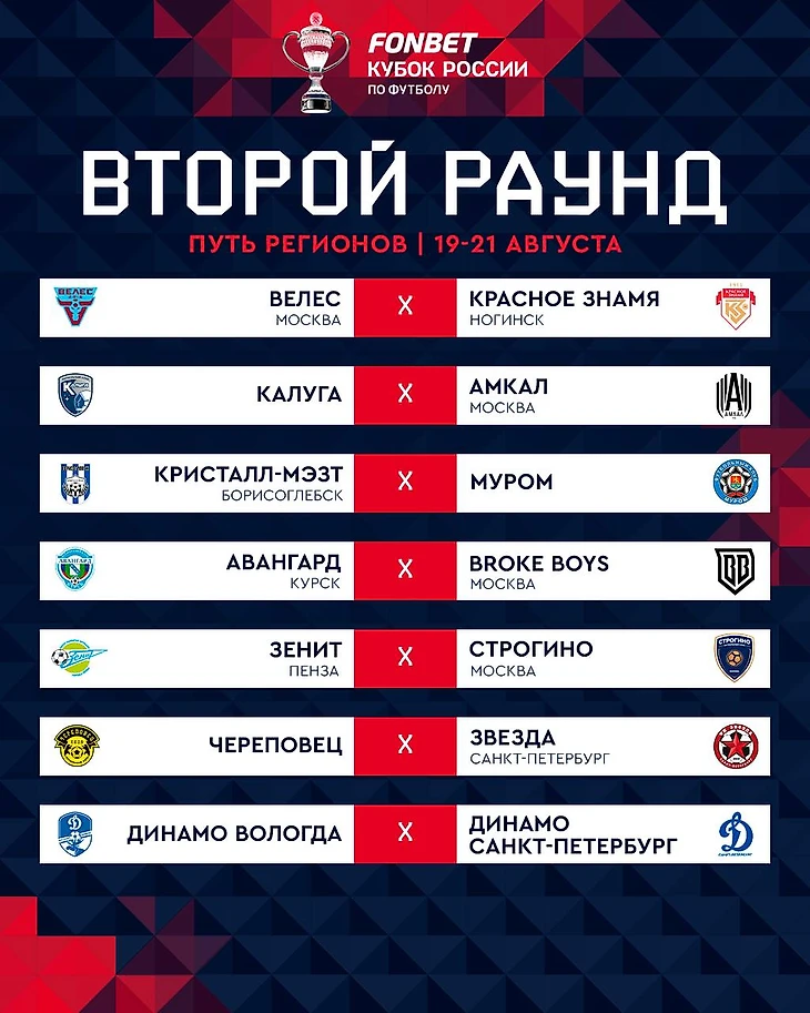 Второй раунд пройдет уже через две недели, с 19 по 21 августа. Пары второго раунды выглядят так. Я отмечу матч «Кристалла-ТЭЗТ» и «Мурома», игру «Калуги» и «Амкала» и противостояние одних из лидеров своих групп во Второй лиге Б вологодского и петербургского «Динамо».