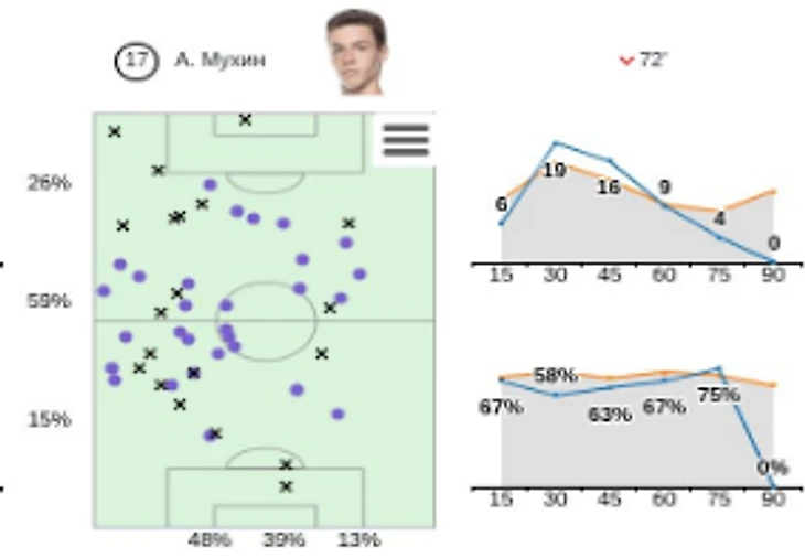 Этот сезон может стать для игрока переходным, так как тот все еще принадлежит «Пари НН», хоть и не особо вписывается в рисунок нового тренера, но как минимум внимание клуба (и не только) на себя обращает. Мухин разнообразен и универсален, объединен общими идеями, способен закрыть важные функции определенного рода, что полезно для тренера «саратовцев» (карта действий (на примере матча с “Нефтехимиком”) показывает его вовлеченность). В ближайшей перспективе - Антон может стать игроком клуба борющегося за повышение в РПЛ.
