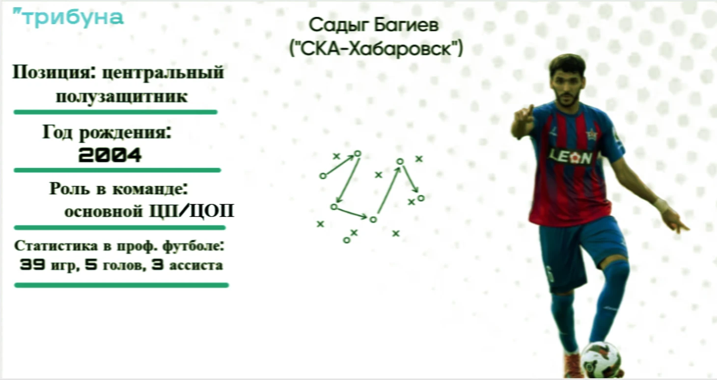 Садыг Багиев (2004 г.р.) — ЦОП. Является воспитанником «Кубани», но в профессиональном футболе дебютировал за других кубанцев - «Кубань Холдинг», после чего, в сезон дебюта поиграл за тамбовский «Спартак» и дубль хабаровского «СКА». В последствии игры в котором на протяжении года игрок удостоился шанса в основном составе (во второй половине прошлого сезона). Этот сезонный период Садыг начинает уже игроком старта в хабаровском коллективе (3 из 3 выходов в стартовом составе в первых турах и победный гол в ворота «Торпедо» (1-0) можно считать успехом).