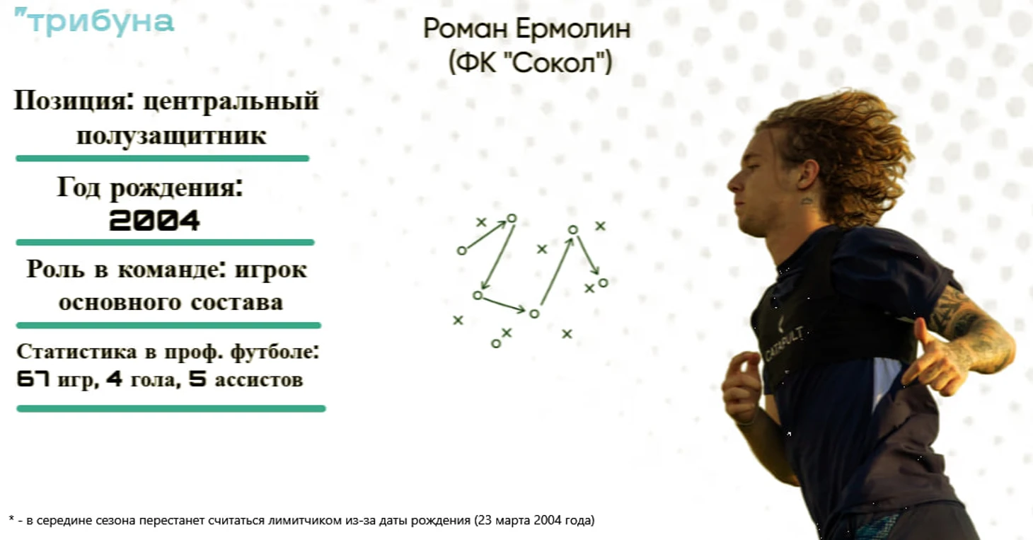 Роман Ермолин (2004 г.р.) — ЦП. Является воспитанником московского «Динамо», до которого поиграл в таких академиях, как «Зенит», «Локо» и «Спартак». После дебютного сезона в профессиональном футболе (за дубль «динамовцев») перешел в «Текстильщик», где сходу стал показывать игру уровня футболиста основного состава (и держал эту планку на протяжении всего сезона). Следующее повышение не заставило себя долго ждать: после успешного периода за игроком пришел клуб Первой Лиги — «Сокол». Адаптация получилась не быстрой — лишь в концовке сезона Роман стал игроком стартового состава. Этот игровой период Роман начал уже в роли полноценного игрока стартового состава своей команды, появившись в старте во всех трех турах начавшегося первенства.