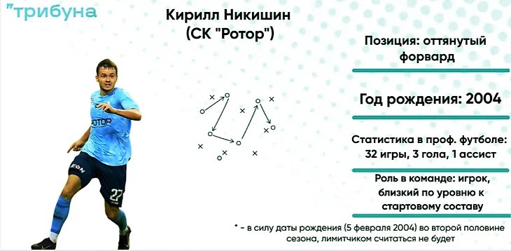 Кирилл Никишин (2004 г.р.) — НАП. Начинал Никишин в «Локомотиве», в который он попал в совсем юношеские годы. За разные команды «железнодорожников» в проф. футболе (с учетом МФЛ) 93 игры, за которые отметился 56 голами и 18 ассистами, даже пару раз выходя за основную команду. В связи с обстоятельствами — в виду оптимального на тот момент игрового времени для игрока (уже привлекался к основе «Локо», хотя шансов больших там не получал, а надо было прогрессировать и играть) — Кирилл перешел в «Тюмень». За 5 месяцев достаточно ярко проявить себя не удалось, но полезность виднелась, потенциал тоже, и летом Никишин был приглашен в «Балтику». Начинал в дубле, но в скором времени начал привлекаться в основу и наигрываться на разных позициях в атаке, но игровая практика была нерегулярна, в силу чего игрока снова пришлось отдать в аренду. Этот сезон Никишин начал в волгоградском «Роторе», проведя в стартовых турах 162 минуты на поле.